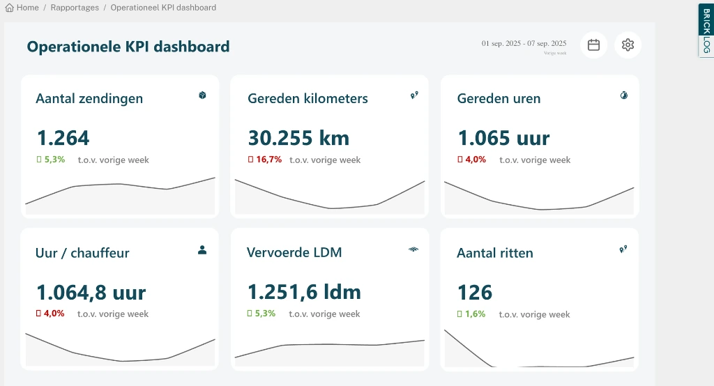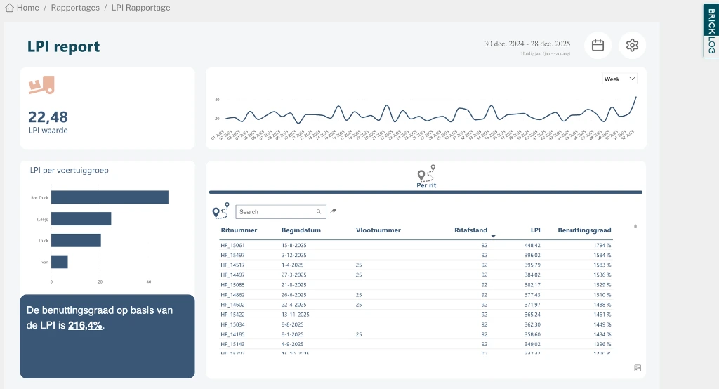 In het dataplatform van Bricklog worden deze rapportages zichtbaar gemaakt. Daarnaast bieden we de LPI-waarde. Dit getal helpt bij het verlagen van de CO₂-uitstoot en het verhogen van de efficiency.