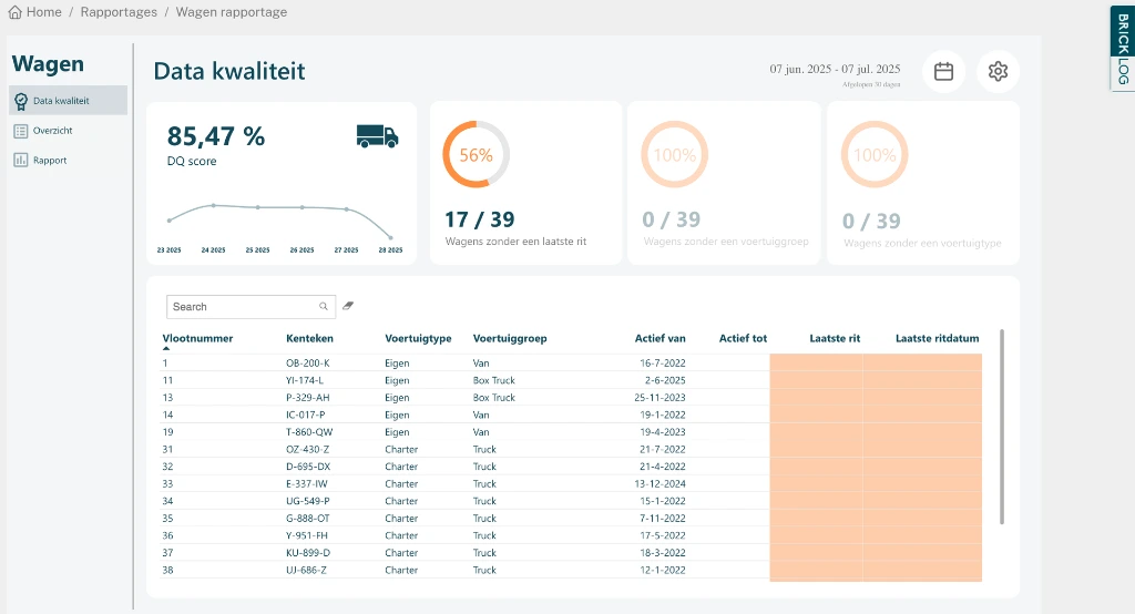 Hiervoor biedt Bricklog ons dataplatform waarop we jouw TMS ontsluiten. Op basis daarvan worden 5 datakwaliteitsrapportages gemaakt waarmee jij gaat werken met een passend begeleidingstraject.