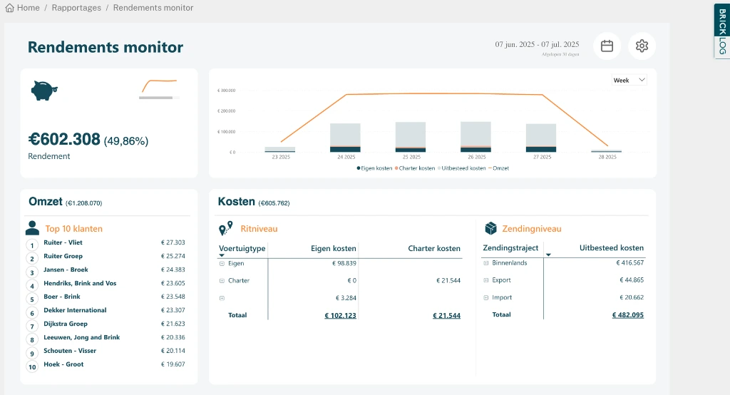 Om ervoor te zorgen dat jij dagelijks nóg meer grip krijgt op je operatie en je rendement biedt Bricklog een drietal extra rapportages. Dit zijn een Operationeel én Financieel KPI Dashboard en onze Operationeel Rendement Monitor.